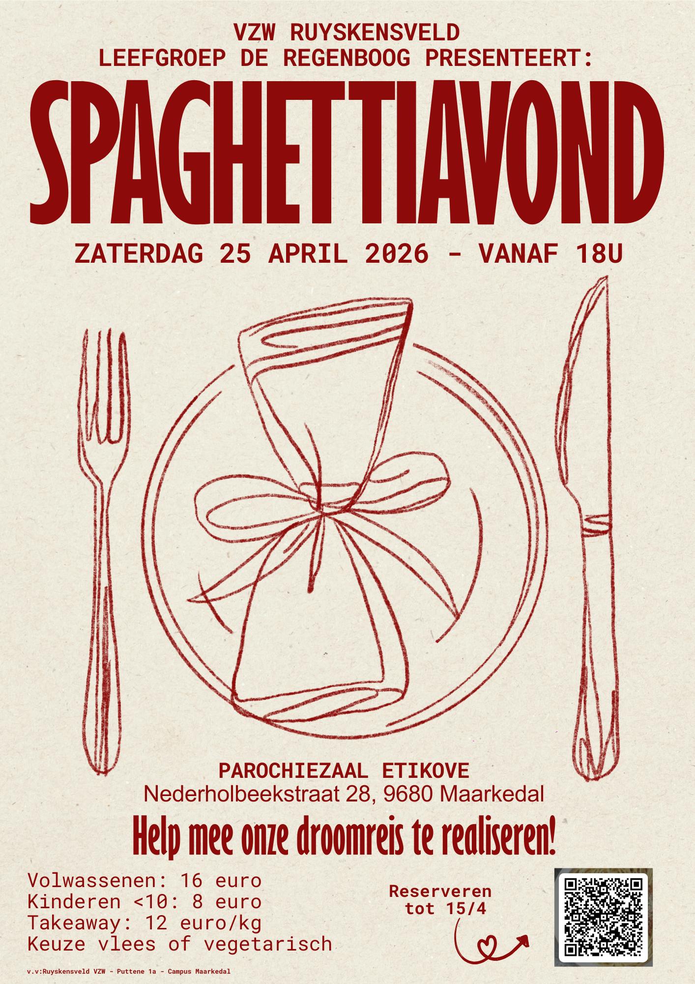 Tien jongeren van leefgroep De Regenboog van Ruyskensveld vzw in Maarkedal werken al maanden aan hun eigen droomreis naar het Gardameer. Om deze reis te realiseren organiseren ze een gezellige spaghettiavond. Geniet van een lekkere spaghetti (vlees of vegetarisch) en een Italiaanse cocktail bij aankomst. Met jouw aanwezigheid help je hun droom stap voor stap waar te maken.